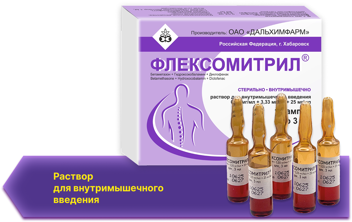 8. Листок-вкладыш – информация для пациента Флексомитрил®, 0,67 мг/мл + 3,33 мг/мл + 25 мг/мл, раствор для внутримышечного введения. Действующие вещества: бетаметазон + гидроксокобаламин + диклофенак.
